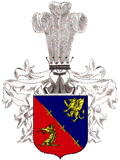 Durch silbernen, hermelinierten Schrägrechtsbalken geteilter Schild: oben links ein schwarzer Drache auf Gold, unten rechts eine schwarze Harpyie auf goldenem Feld, darüber ein Topfhelm und Devisenband.