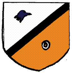 Durch schwarzen Schräglinksbalken geteilter Schild. Oben rechts ein blauer Elsternkopf auf Silber, unten links ein silberner Ring vor orangenem Grund.