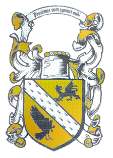 Durch silbernen, hermelinierten Schrägrechtsbalken geteilter Schild: oben links ein schwarzer Drache auf Gold, unten rechts eine schwarze Harpyie auf goldenem Feld, darüber ein Topfhelm und Devisenband.